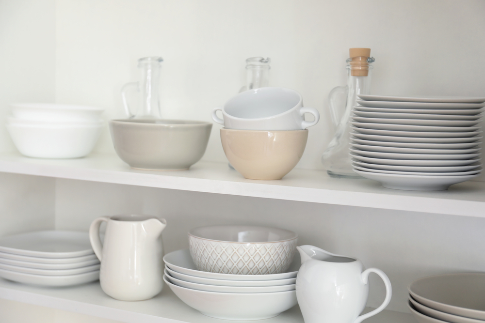 Opt for storage options that have doors that will hide the things you’re not using. When styling open shelving, choose items that match your color palette, leave plenty of open space, and use boxes or baskets to organize and hide loose items.